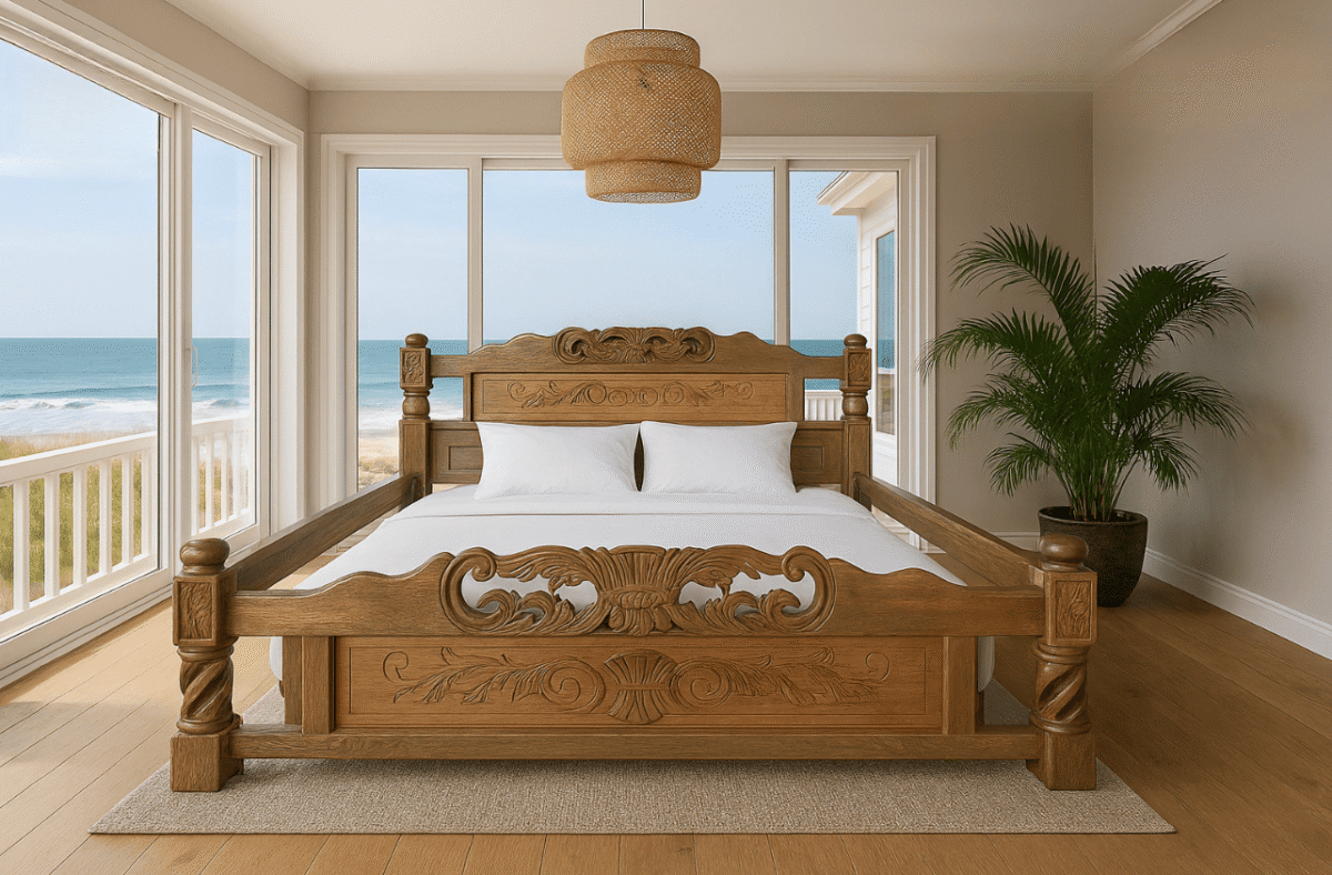 Camas y cabeceras con tallados artesanales y acabados de alta calidad.